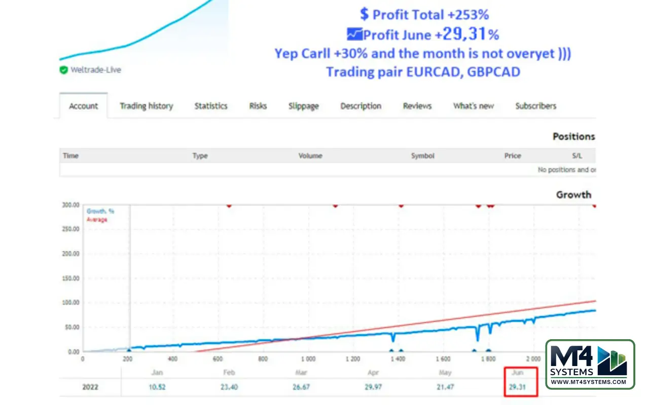 - Which currency pairs are recommended?The EA performs exceptionally well with major pairs such as GBPUSD, EURUSD, EURCAD, and GBPCAD.