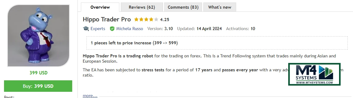 The Expert Hippo Trader Pro EA MT4 is a cutting-edge Forex trading robot designed to automate trading strategies on the MetaTrader 4 platform. Built with advanced algorithms, this EA ensures high accuracy, low risk, and consistent profitability, making it a top choice for traders worldwide.
