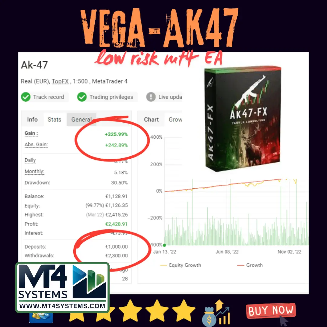 - What are the recommended settings for the VEGA AK47 EA?The EA is optimized for EURUSD and AUDCAD currency pairs, suitable for intraday to multiday trading, with a recommended minimum account balance of $500.