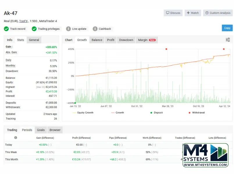 The VEGA AK47 EA operates by analyzing market conditions and executing trades based on predefined strategies. It combines scalping techniques to profit from small price movements and Fibonacci retracement levels to identify optimal entry and exit points. This approach allows the EA to adapt to dynamic market conditions, continuously refining its strategies based on historical market data.